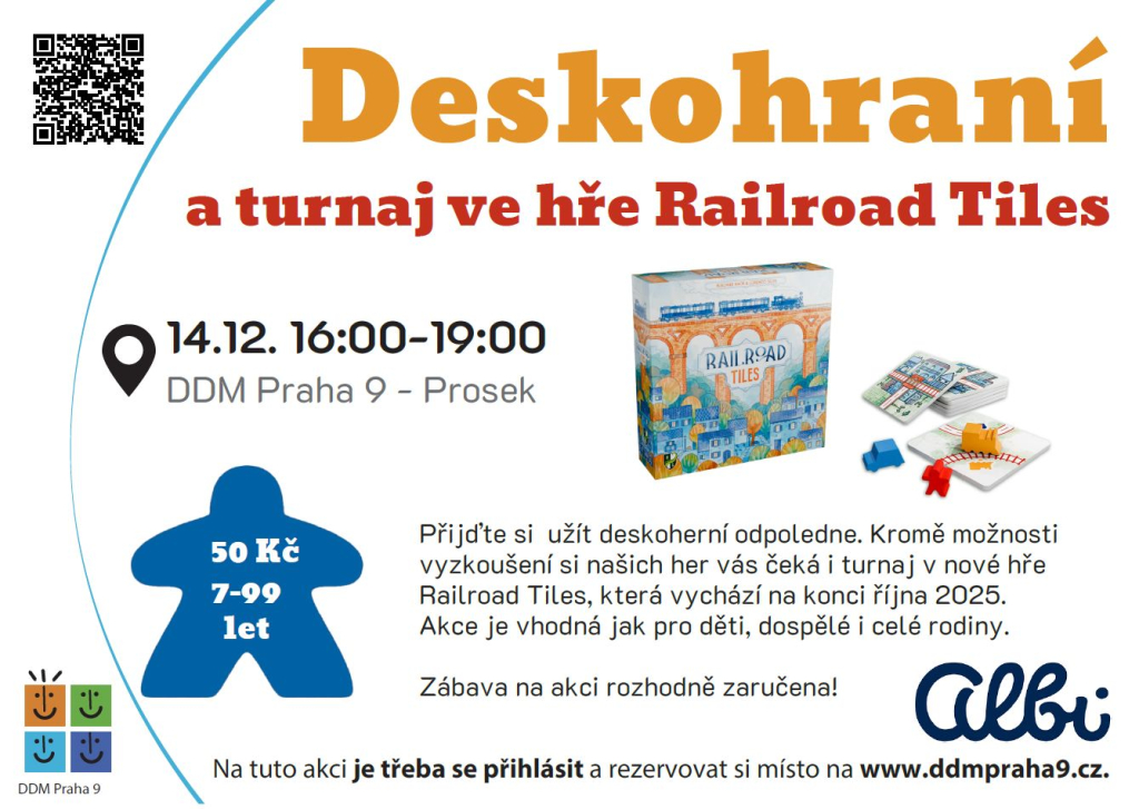 Přijďte si užít deskoherní odpoledne. Kromě možnosti vyzkoušení si našich her vás čeká i turnaj v nové hře Railroad Tiles, která vychází na konci října. Akce je vhodná jak pro děti, tak dospělé.